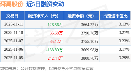 证券之星消息,11月11日,舜禹股份(301519)融资买入102.18万元,融资偿还228.75万元,融资净卖出126.56万元,融资余额3664.22万元。