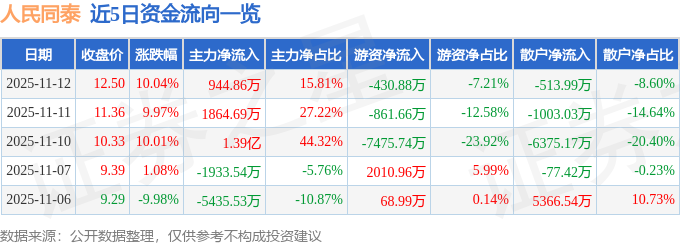 证券之星消息,截至2025年11月12日收盘,人民同泰(600829)报收于12.5元,上涨10.04%,已连续涨停3天,换手率0.82%,成交量4.78万手,成交额5977.98万元。