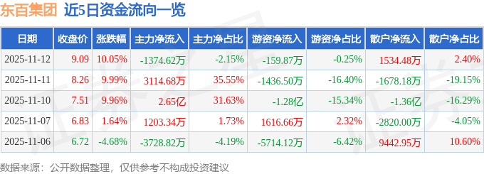 证券之星消息,截至2025年11月12日收盘,东百集团(600693)报收于9.09元,上涨10.05%,已连续涨停3天,换手率8.12%,成交量70.57万手,成交额6.4亿元。