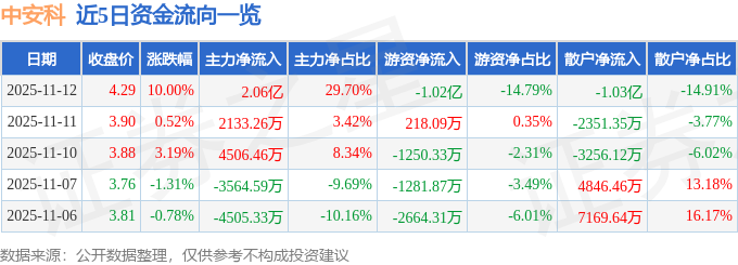 证券之星消息,截至2025年11月12日收盘,中安科(600654)报收于4.29元,上涨10.0%,涨停,换手率7.09%,成交量164.3万手,成交额6.92亿元。