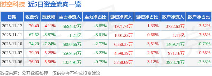证券之星消息,截至2025年11月12日收盘,时空科技(605178)报收于70.4元,上涨4.11%,换手率20.77%,成交量20.58万手,成交额14.8亿元。