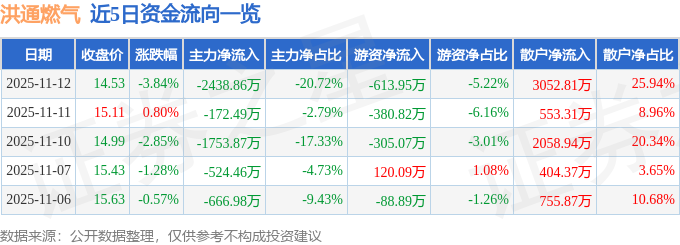 证券之星消息,截至2025年11月12日收盘,洪通燃气(605169)报收于14.53元,下跌3.84%,换手率2.83%,成交量8.01万手,成交额1.18亿元。