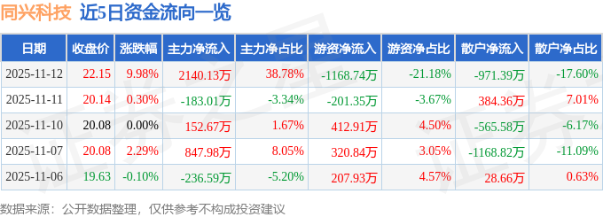 证券之星消息,截至2025年11月12日收盘,同兴科技(003027)报收于22.15元,上涨9.98%,涨停,换手率2.38%,成交量2.49万手,成交额5518.7万元。