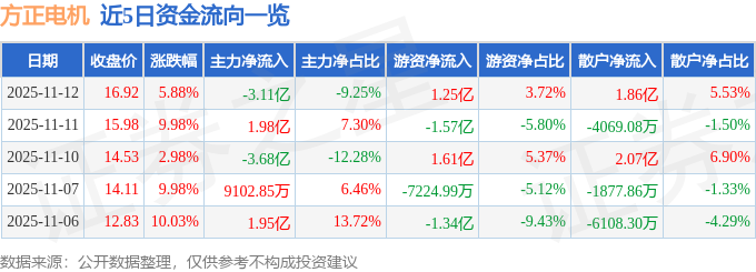 证券之星消息,截至2025年11月12日收盘,方正电机(002196)报收于16.92元,上涨5.88%,换手率40.77%,成交量199.06万手,成交额33.59亿元。