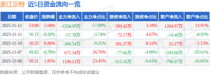 证券之星消息,截至2025年11月12日收盘,浙江正特(001238)报收于53.0元,上涨5.68%,换手率1.69%,成交量1.75万手,成交额9093.05万元。