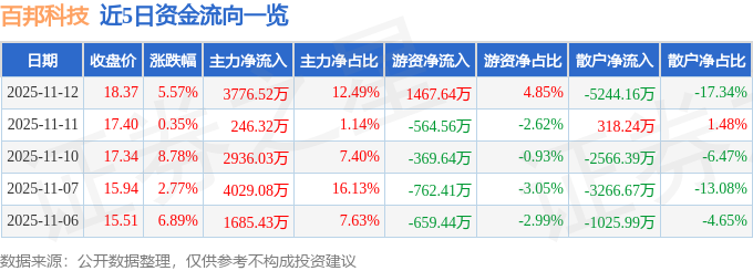 证券之星消息,截至2025年11月12日收盘,百邦科技(300736)报收于18.37元,上涨5.57%,换手率13.35%,成交量16.71万手,成交额3.02亿元。