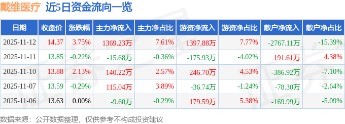 证券之星消息,截至2025年11月12日收盘,戴维医疗(300314)报收于14.37元,上涨3.75%,换手率8.8%,成交量12.65万手,成交额1.8亿元。