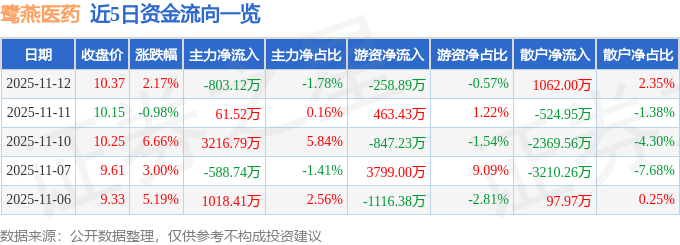 证券之星消息,截至2025年11月12日收盘,鹭燕医药(002788)报收于10.37元,上涨2.17%,换手率11.32%,成交量43.22万手,成交额4.52亿元。