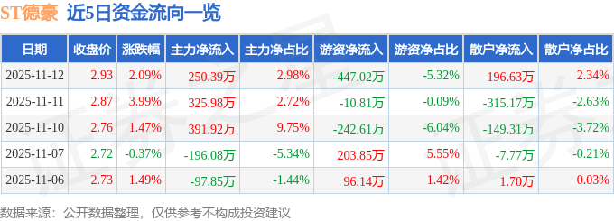 证券之星消息,截至2025年11月12日收盘,ST德豪(002005)报收于2.93元,上涨2.09%,换手率1.67%,成交量29.28万手,成交额8398.98万元。