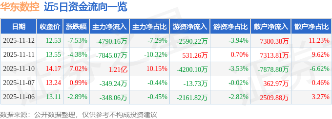 证券之星消息,截至2025年11月12日收盘,华东数控(002248)报收于12.53元,下跌7.53%,换手率16.65%,成交量51.2万手,成交额6.57亿元。