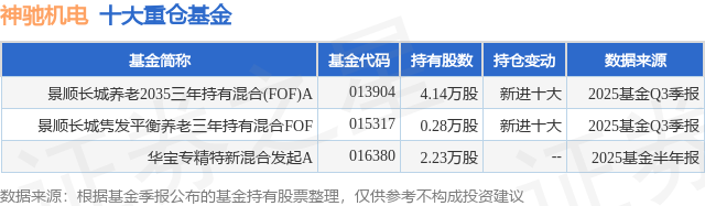 根据2025基金Q3季报公募基金重仓股数据,重仓该股的公募基金共2家,其中持有数量最多的公募基金为景顺长城基金的景顺长城养老2035三年持有混合(FOF)A。景顺长城养老2035三年持有混合(FOF)A目前规模为2.36亿元,最新净值1.0908(11月7日),较上一交易日下跌0.4%,近一年上涨16.12%。该公募基金现任基金经理为江虹 赵思轩。江虹在任的基金产品包括:景顺长城隽发平衡养老三年持有混合FOF,管理时间为2022年11月16日至今,期间收益率为17.2%;景顺长城保守养老一年持有混合(FOF)A,管理时间为2024年3月20日至今,期间收益率为7.94%;景顺长城臻品三个月持有期混合(FOF)A,管理时间为2024年12月26日至今,期间收益率为21.02%。赵思轩在任的基金产品包括:景顺长城隽丰平衡养老三年持有混合(FOF)A,管理时间为2023年7月26日至今,期间收益率为18.16%;