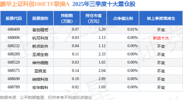 鹏华上证科创100ETF联接A的前十大重仓股如下:
