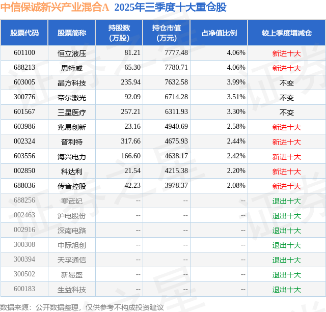 根据2025基金Q3季报公募基金重仓股数据,重仓该股的公募基金共7家,其中持有数量最多的公募基金为中信保诚基金的中信保诚新兴产业混合A。中信保诚新兴产业混合A目前规模为18.39亿元,最新净值2.7072(11月11日),较上一交易日上涨0.21%,近一年上涨19.45%。该公募基金现任基金经理为孙浩中。孙浩中在任的基金产品包括:中信保诚至兴混合A,管理时间为2020年11月19日至今,期间收益率为32.26%;中信保诚中小盘混合A,管理时间为2021年8月30日至今,期间收益率为-10.55%;中信保诚周期轮动混合(LOF)A,管理时间为2023年9月8日至今,期间收益率为37.63%。