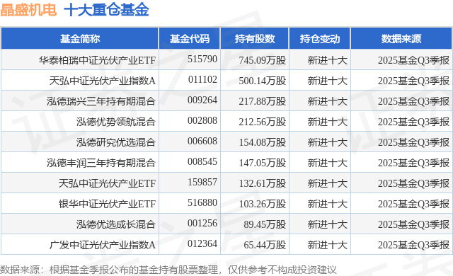 根据2025基金Q3季报公募基金重仓股数据,重仓该股的公募基金共36家,其中持有数量最多的公募基金为华泰柏瑞基金的华泰柏瑞中证光伏产业ETF。华泰柏瑞中证光伏产业ETF目前规模为139.76亿元,最新净值1.0768(11月11日),较上一交易日下跌0.43%,近一年上涨17.63%。该公募基金现任基金经理为李茜 李沐阳。李茜在任的基金产品包括:华泰柏瑞上证红利ETF,管理时间为2019年11月5日至今,期间收益率为57.43%;华泰柏瑞中证港股通50ETF,管理时间为2020年12月30日至今,期间收益率为20.86%;华泰柏瑞中证物联网主题ETF,管理时间为2021年3月31日至今,期间收益率为36.74%。李沐阳在任的基金产品包括:华泰柏瑞光伏ETF联接A,管理时间为2021年8月17日至今,期间收益率为-34.19%;华泰柏瑞中韩半导体ETF(QDII),管理时间为2022年11月2日至今,期间收益率为147.28%;华泰柏瑞纳斯达克100ETF(QDII),管理时间为2023年3月1日至今,期间收益率为104.33%。