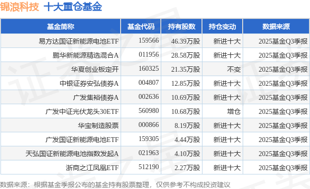 根据2025基金Q3季报公募基金重仓股数据,重仓该股的公募基金共17家,其中持有数量最多的公募基金为易方达基金的易方达国证新能源电池ETF。易方达国证新能源电池ETF目前规模为18.21亿元,最新净值2.1869(11月11日),较上一交易日上涨0.05%,近一年上涨50.22%。该公募基金现任基金经理为李栩。李栩在任的基金产品包括:易方达中证物联网主题ETF,管理时间为2022年11月26日至今,期间收益率为64.99%;易方达中证沪港深500ETF,管理时间为2022年12月3日至今,期间收益率为42.83%;易方达中证港股通互联网ETF,管理时间为2023年5月31日至今,期间收益率为54.16%;易方达中证2000ETF,管理时间为2023年9月13日至今,期间收益率为53.51%。