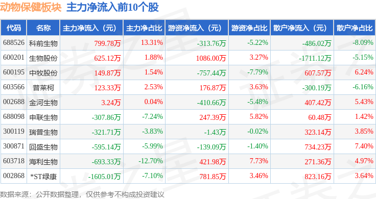 从资金流向上来看,当日动物保健板块主力资金净流出3594.04万元,游资资金净流入1536.66万元,散户资金净流入2057.38万元。动物保健板块个股资金流向见下表: