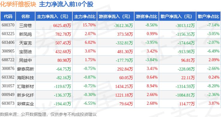 从资金流向上来看,当日化学纤维板块主力资金净流出3.39亿元,游资资金净流入1.46亿元,散户资金净流入1.93亿元。化学纤维板块个股资金流向见下表: