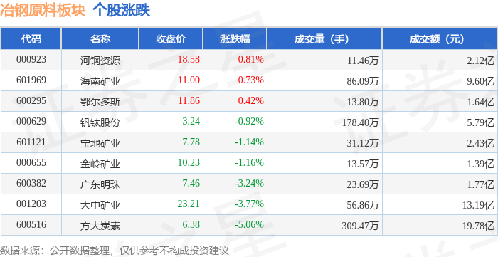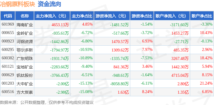 从资金流向上来看,当日冶钢原料板块主力资金净流出5.73亿元,游资资金净流入7568.24万元,散户资金净流入4.97亿元。冶钢原料板块个股资金流向见下表:
