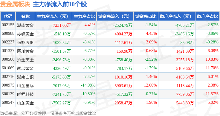 从资金流向上来看,当日贵金属板块主力资金净流出3.98亿元,游资资金净流入1.33亿元,散户资金净流入2.64亿元。贵金属板块个股资金流向见下表: