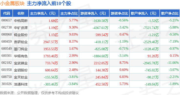 从资金流向上来看,当日小金属板块主力资金净流出6.88亿元,游资资金净流出8655.66万元,散户资金净流入7.75亿元。小金属板块个股资金流向见下表: