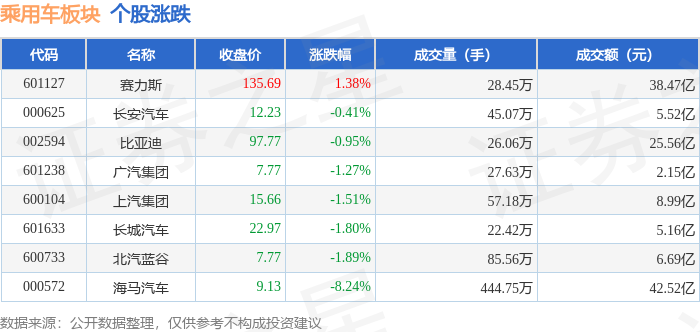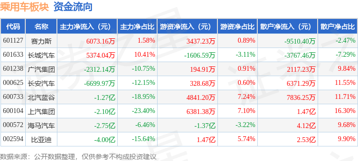 从资金流向上来看,当日乘用车板块主力资金净流出9.87亿元,游资资金净流入1.46亿元,散户资金净流入8.42亿元。乘用车板块个股资金流向见下表: