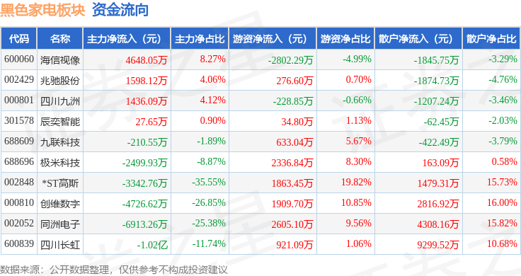 从资金流向上来看,当日黑色家电板块主力资金净流出2.02亿元,游资资金净流入7549.49万元,散户资金净流入1.27亿元。黑色家电板块个股资金流向见下表: