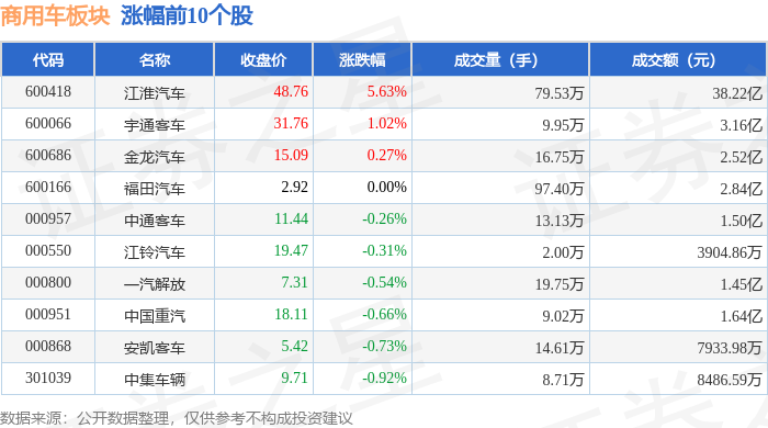 证券之星消息,11月12日商用车板块较上一交易日上涨1.62%,江淮汽车领涨。当日上证指数报收于4000.14,下跌0.07%。深证成指报收于13240.62,下跌0.36%。商用车板块个股涨跌见下表: