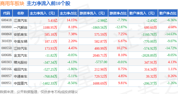 从资金流向上来看,当日商用车板块主力资金净流入3.89亿元,游资资金净流出2.45亿元,散户资金净流出1.44亿元。商用车板块个股资金流向见下表: