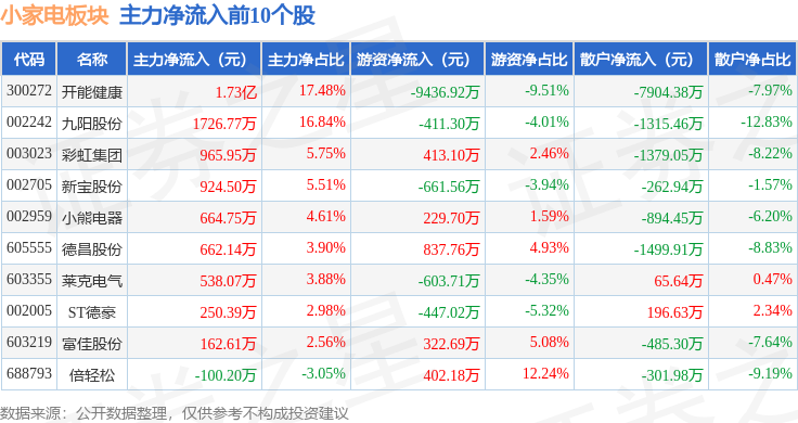 从资金流向上来看,当日小家电板块主力资金净流入1.79亿元,游资资金净流出3816.02万元,散户资金净流出1.41亿元。小家电板块个股资金流向见下表: