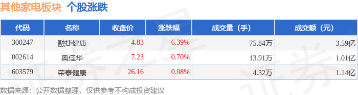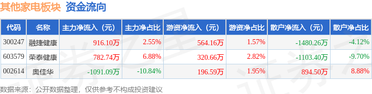从资金流向上来看,当日其他家电板块主力资金净流入607.75万元,游资资金净流入1081.41万元,散户资金净流出1689.17万元。其他家电板块个股资金流向见下表: