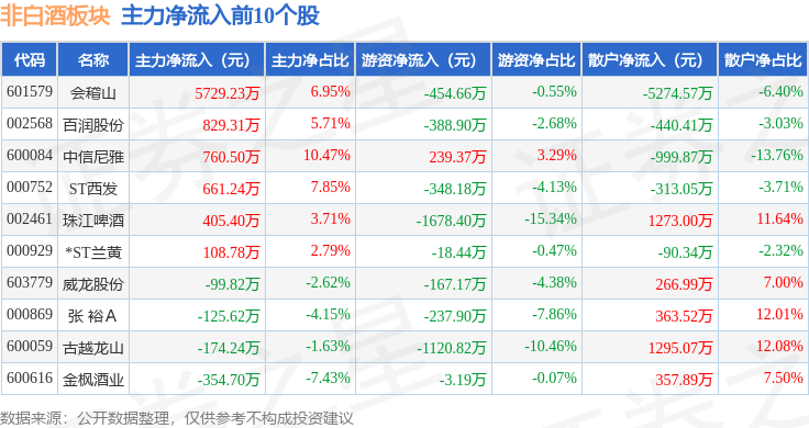 从资金流向上来看,当日非白酒板块主力资金净流出2891.23万元,游资资金净流出3245.93万元,散户资金净流入6137.16万元。非白酒板块个股资金流向见下表: