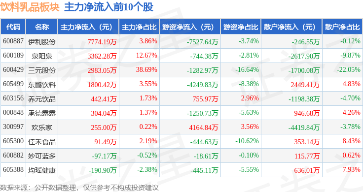 从资金流向上来看,当日饮料乳品板块主力资金净流出9697.31万元,游资资金净流出1.94亿元,散户资金净流入2.91亿元。饮料乳品板块个股资金流向见下表: