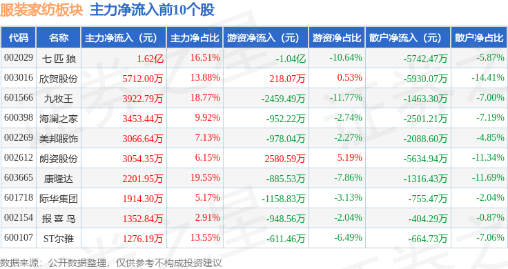 从资金流向上来看,当日服装家纺板块主力资金净流入2.05亿元,游资资金净流出5096.86万元,散户资金净流出1.54亿元。服装家纺板块个股资金流向见下表: