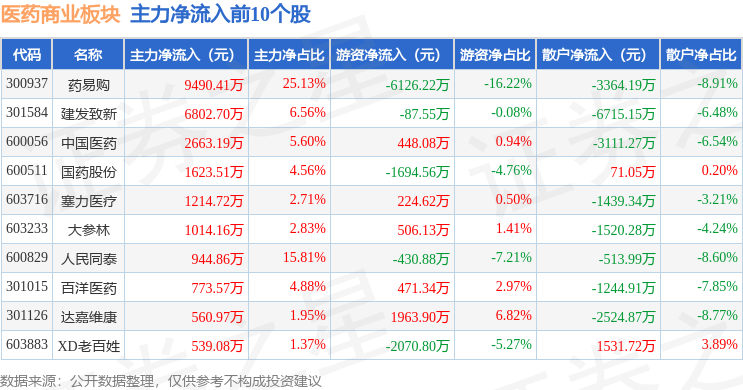 从资金流向上来看,当日医药商业板块主力资金净流出574.92万元,游资资金净流出7672.16万元,散户资金净流入8247.08万元。医药商业板块个股资金流向见下表:
