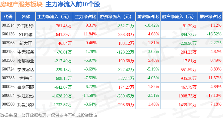 从资金流向上来看,当日房地产服务板块主力资金净流出6049.93万元,游资资金净流入678.61万元,散户资金净流入5371.32万元。房地产服务板块个股资金流向见下表: