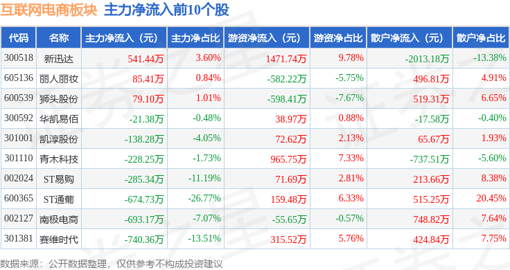 从资金流向上来看,当日互联网电商板块主力资金净流出1.31亿元,游资资金净流入1259.5万元,散户资金净流入1.19亿元。互联网电商板块个股资金流向见下表: