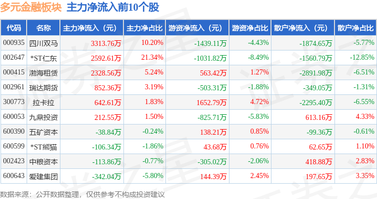 从资金流向上来看,当日多元金融板块主力资金净流出4.26亿元,游资资金净流出299.81万元,散户资金净流入4.29亿元。多元金融板块个股资金流向见下表: