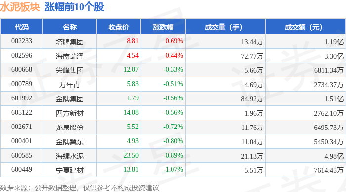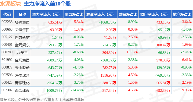 从资金流向上来看,当日水泥板块主力资金净流出4.27亿元,游资资金净流入7013.31万元,散户资金净流入3.57亿元。水泥板块个股资金流向见下表: