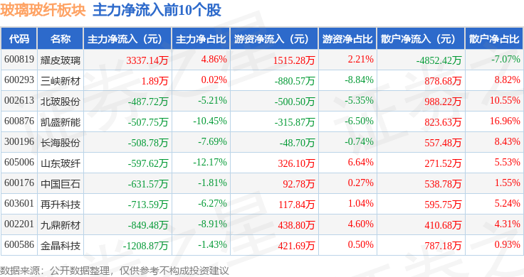 从资金流向上来看,当日玻璃玻纤板块主力资金净流出2.06亿元,游资资金净流出1860.94万元,散户资金净流入2.24亿元。玻璃玻纤板块个股资金流向见下表: