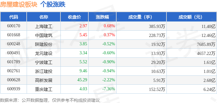 证券之星消息,11月12日房屋建设板块较上一交易日下跌0.02%,重庆建工领跌。当日上证指数报收于4000.14,下跌0.07%。深证成指报收于13240.62,下跌0.36%。房屋建设板块个股涨跌见下表:
