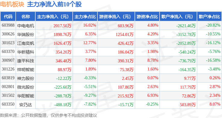 从资金流向上来看,当日电机板块主力资金净流出10.65亿元,游资资金净流入2.02亿元,散户资金净流入8.63亿元。电机板块个股资金流向见下表: