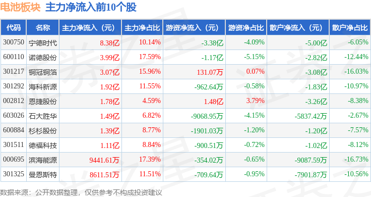 从资金流向上来看,当日电池板块主力资金净流出22.08亿元,游资资金净流入7.46亿元,散户资金净流入14.63亿元。电池板块个股资金流向见下表: