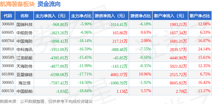 从资金流向上来看,当日航海装备板块主力资金净流出6.84亿元,游资资金净流入1.27亿元,散户资金净流入5.57亿元。航海装备板块个股资金流向见下表: