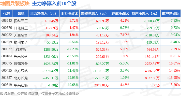 从资金流向上来看,当日地面兵装板块主力资金净流出6.78亿元,游资资金净流入5563.02万元,散户资金净流入6.22亿元。地面兵装板块个股资金流向见下表: