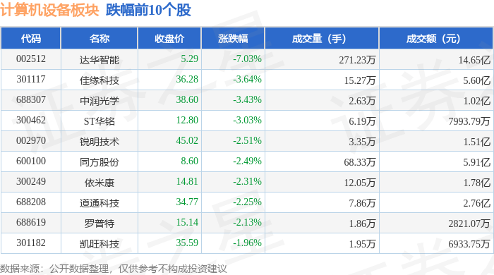 证券之星消息,11月12日计算机设备板块较上一交易日下跌0.54%,达华智能领跌。当日上证指数报收于4000.14,下跌0.07%。深证成指报收于13240.62,下跌0.36%。计算机设备板块个股涨跌见下表: