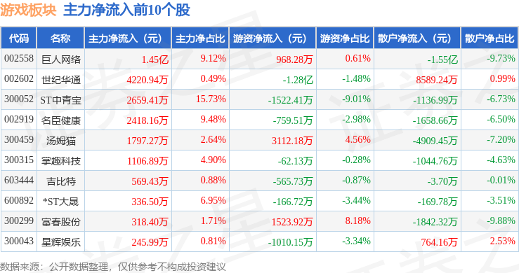 从资金流向上来看,当日游戏板块主力资金净流出3.79亿元,游资资金净流入6424.86万元,散户资金净流入3.15亿元。游戏板块个股资金流向见下表: