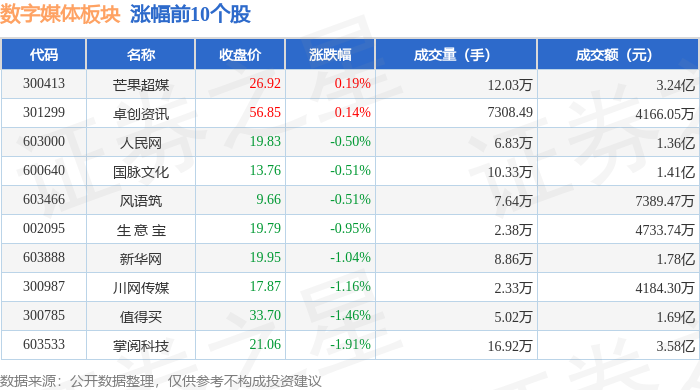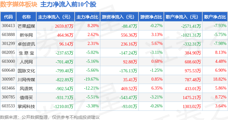 从资金流向上来看,当日数字媒体板块主力资金净流出1.77亿元,游资资金净流入4025.01万元,散户资金净流入1.37亿元。数字媒体板块个股资金流向见下表: