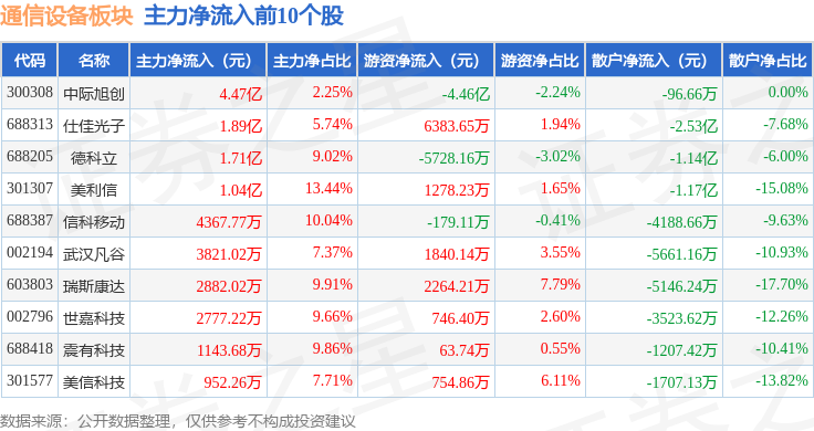 从资金流向上来看,当日通信设备板块主力资金净流出30.62亿元,游资资金净流出1.47亿元,散户资金净流入32.08亿元。通信设备板块个股资金流向见下表: