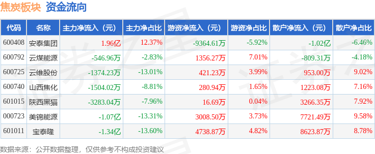 从资金流向上来看,当日焦炭板块主力资金净流出1.12亿元,游资资金净流入457.89万元,散户资金净流入1.08亿元。焦炭板块个股资金流向见下表: