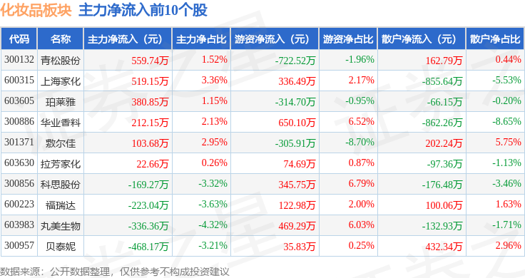 从资金流向上来看,当日化妆品板块主力资金净流出6685.81万元,游资资金净流入6390.98万元,散户资金净流入294.83万元。化妆品板块个股资金流向见下表: